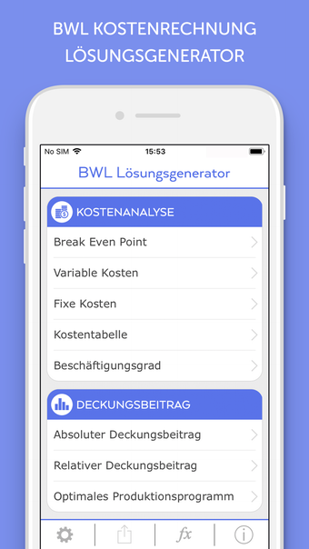 De BWL Lösungsgenerator is een krachtige educatieve applicatie voor iPhone, ontworpen voor studenten in bedrijfseconomie en aanverwante vakgebieden. Deze app stelt gebruikers in staat om diverse rekeningen en taken in de kostenrekening en het financieel beheer eenvoudig op te lossen. Met een gebruiksvriendelijke interface kunnen cijfers snel worden ingevoerd, waarna de app de resultaten in overzichtelijke tabellen presenteert. Dit maakt het mogelijk om de uitkomsten te controleren en te vergelijken met eigen berekeningen.